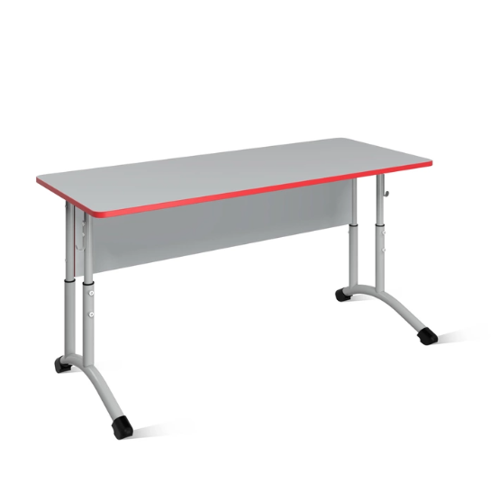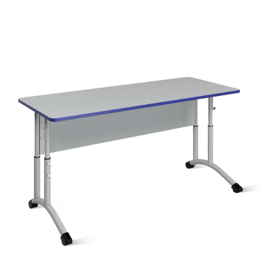 Стол состоит из столешницы, царги и опор. Столешница и царга изготовлены из ЛДСП класса эмиссии Е1, толщиной 16 мм. Столешня облицована ударопрочной кромкой ПВХ 2 мм. Края столешницы закруглены радиусом 30 мм. Столешня крепится к каркасу винтами М6 через металлические футорки, что позволяет сохранить столу гладкую поверхность. Царга стола облицована ударопрочной кромкой ПВХ 0,4 мм. Опоры изготовлены из стальной трубы круглого сечения Ø32х1,5 мм; Ø32х1,2 мм; Ø25х1,2 мм и квадратного профиля 25х25х1,2 мм с образованием телескопической конструкции с возможностью регулировки высоты в трех положениях, закрепляя винтами М8. Крепление царги к каркасу осуществляется с помощью евровинтов 7х70 мм. Металлокаркас окрашен защитной полимерно-порошковой эмалью. Концы труб закрыты пластиковыми заглушками. С боков стола имеются металлические крючки. Изготавливается в двух ростовых группах в трёх диапазонах регулирования (3-5; 5-7) в соответствии с ГОСТ 11015-93