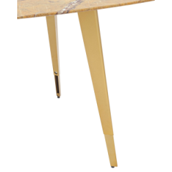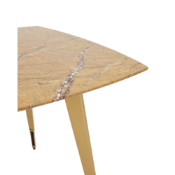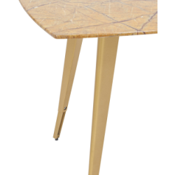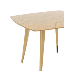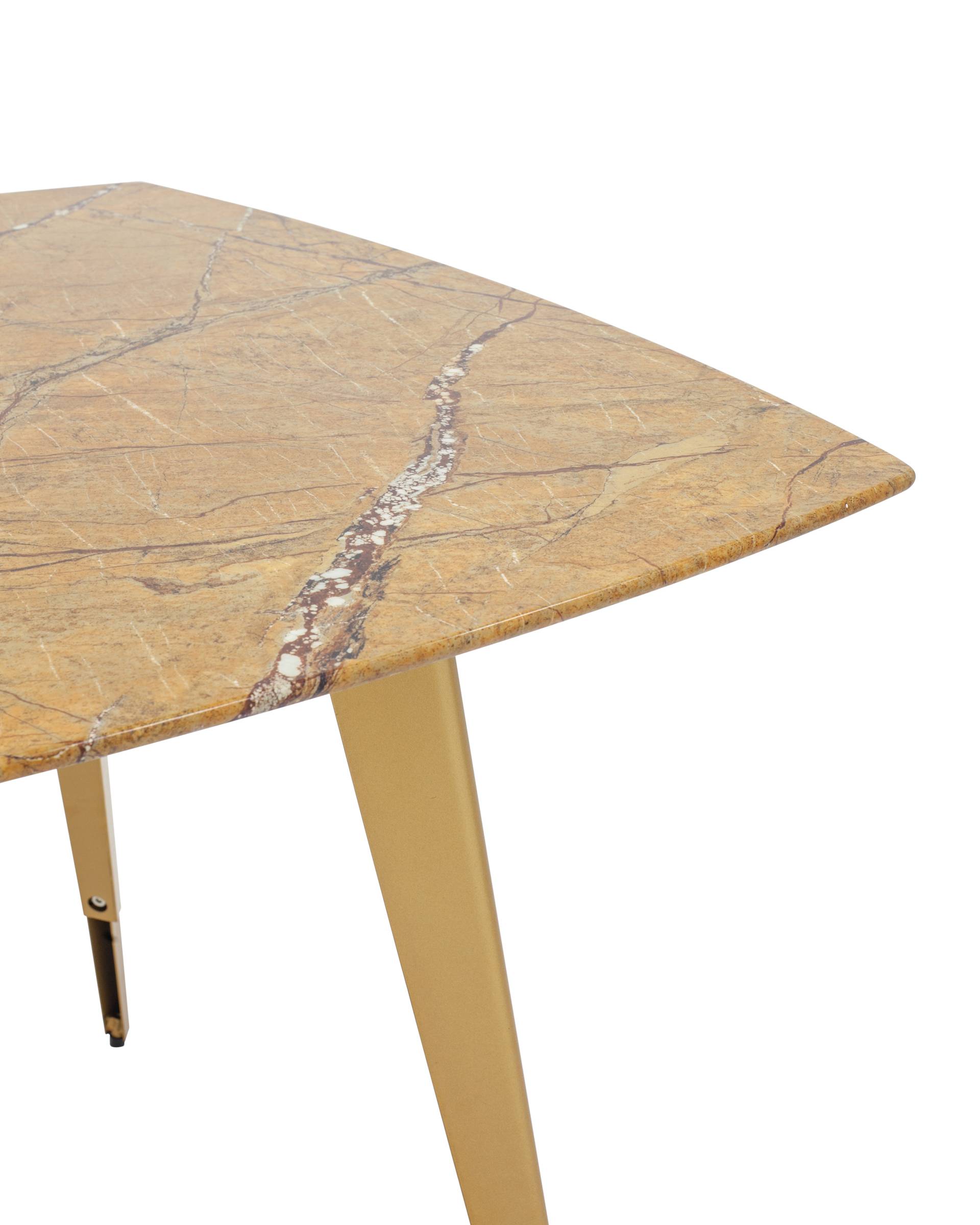 Обеденный стол с красивой стеклянной столешницей насыщенного цвета охры с рисунком под мрамор.