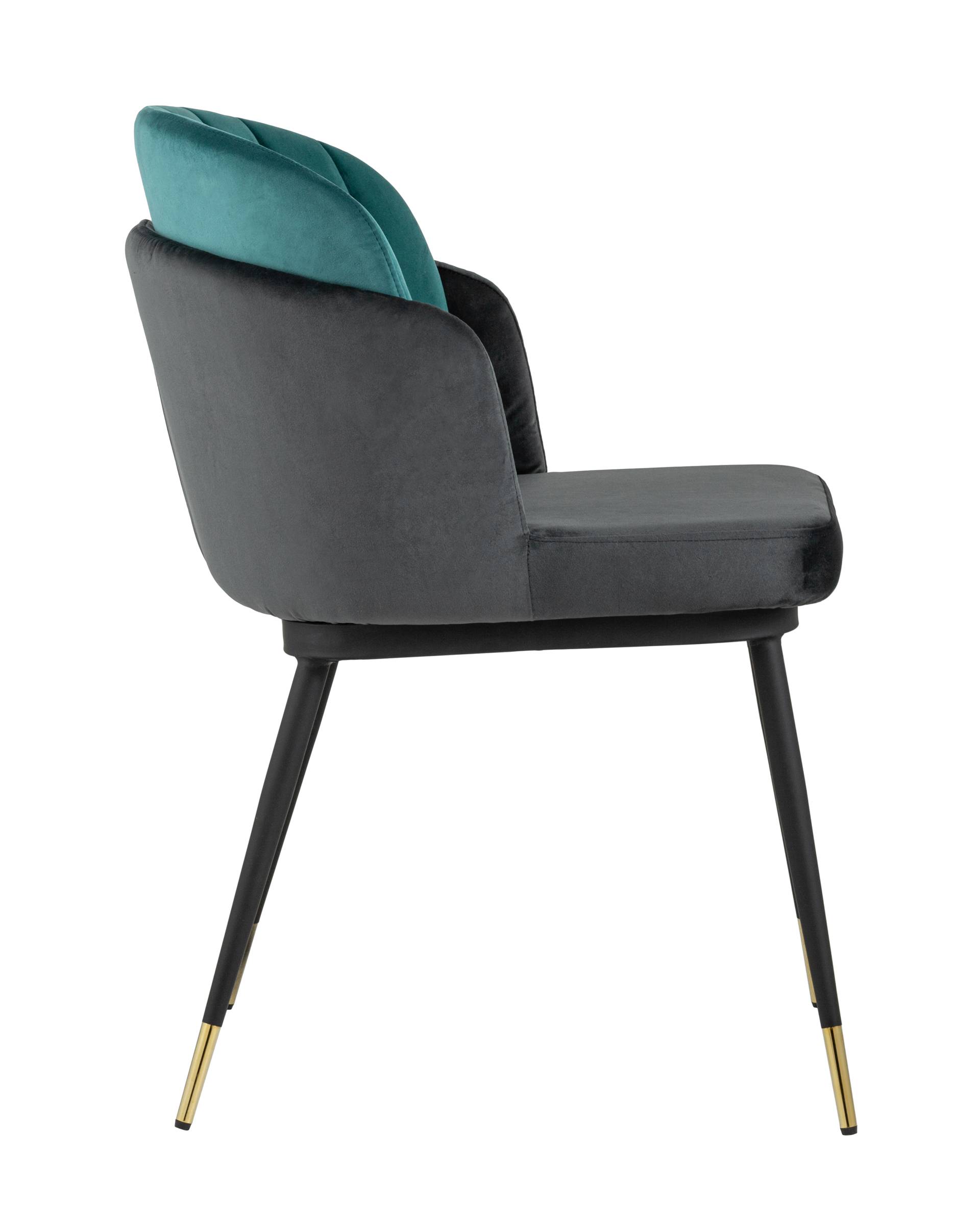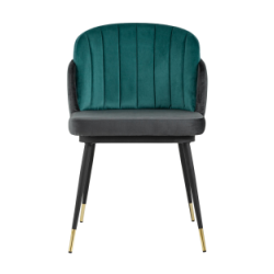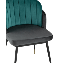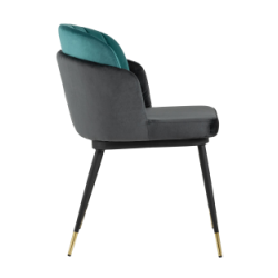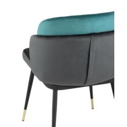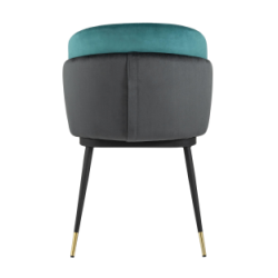 Мягкий двухцветный кухонный стул с обивкой из велюра. Надежная опора достигается благодаря металлическому каркасу и удобным устойчивым ножкам, красиво украшенным золотом. Спинка состоит из двух элементов, внутренняя часть с вертикальной строчкой.