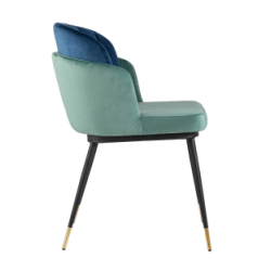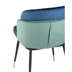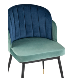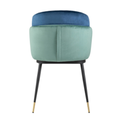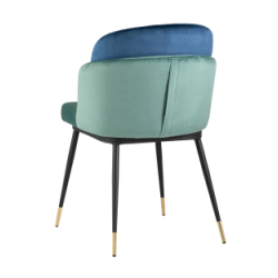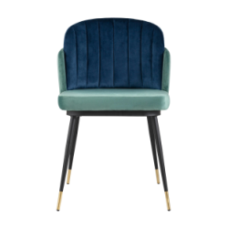 Мягкий двухцветный кухонный стул с обивкой из велюра. Надежная опора достигается благодаря металлическому каркасу и удобным устойчивым ножкам, красиво украшенным золотом. Спинка состоит из двух элементов, внутренняя часть с вертикальной строчкой.