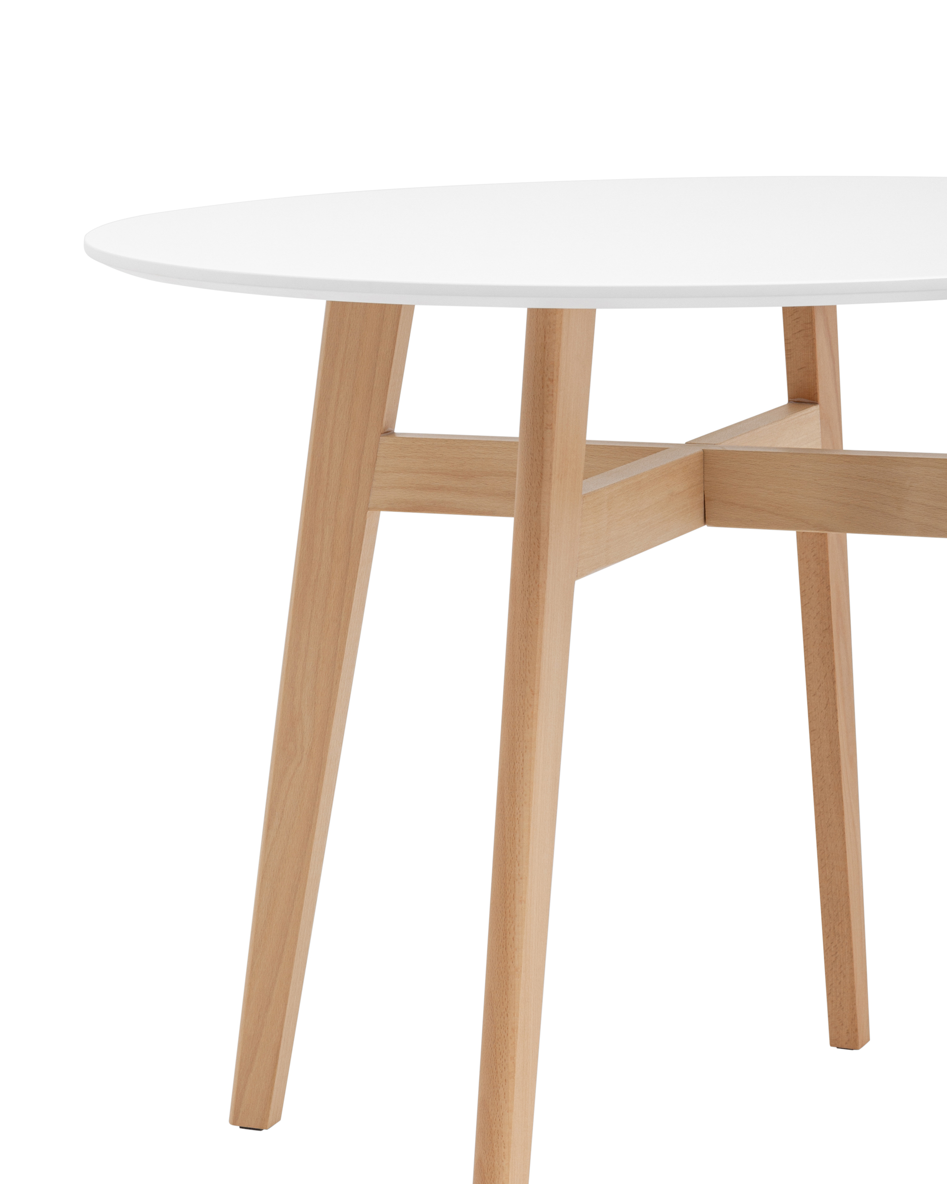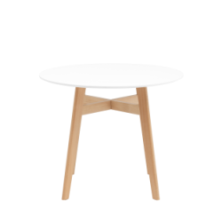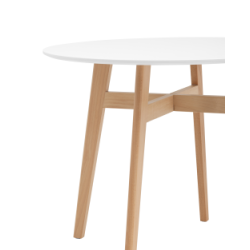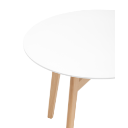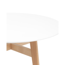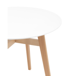 Круглая столешница выполнена из МДФ, окрашенного в белый цвет. Ножки стола изготовлены из массива дерева.