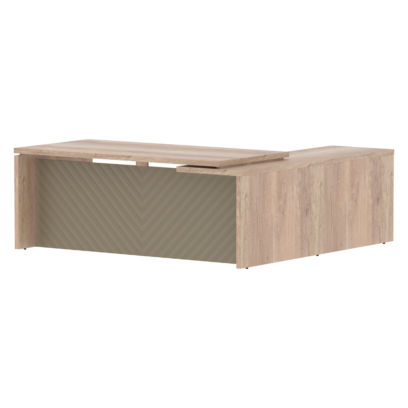 Столешница и опоры из ЛДСП толщиной 38мм с кромкой ПВХ т.2мм в цвет ЛДСП, расположение левое, правое. Стол комплектуется регулируемыми опорами. Фронтальная панель из одностороннего МДФ т.19мм фрезерованного крашенного матовой эмалью, высотой до пола h=640мм.