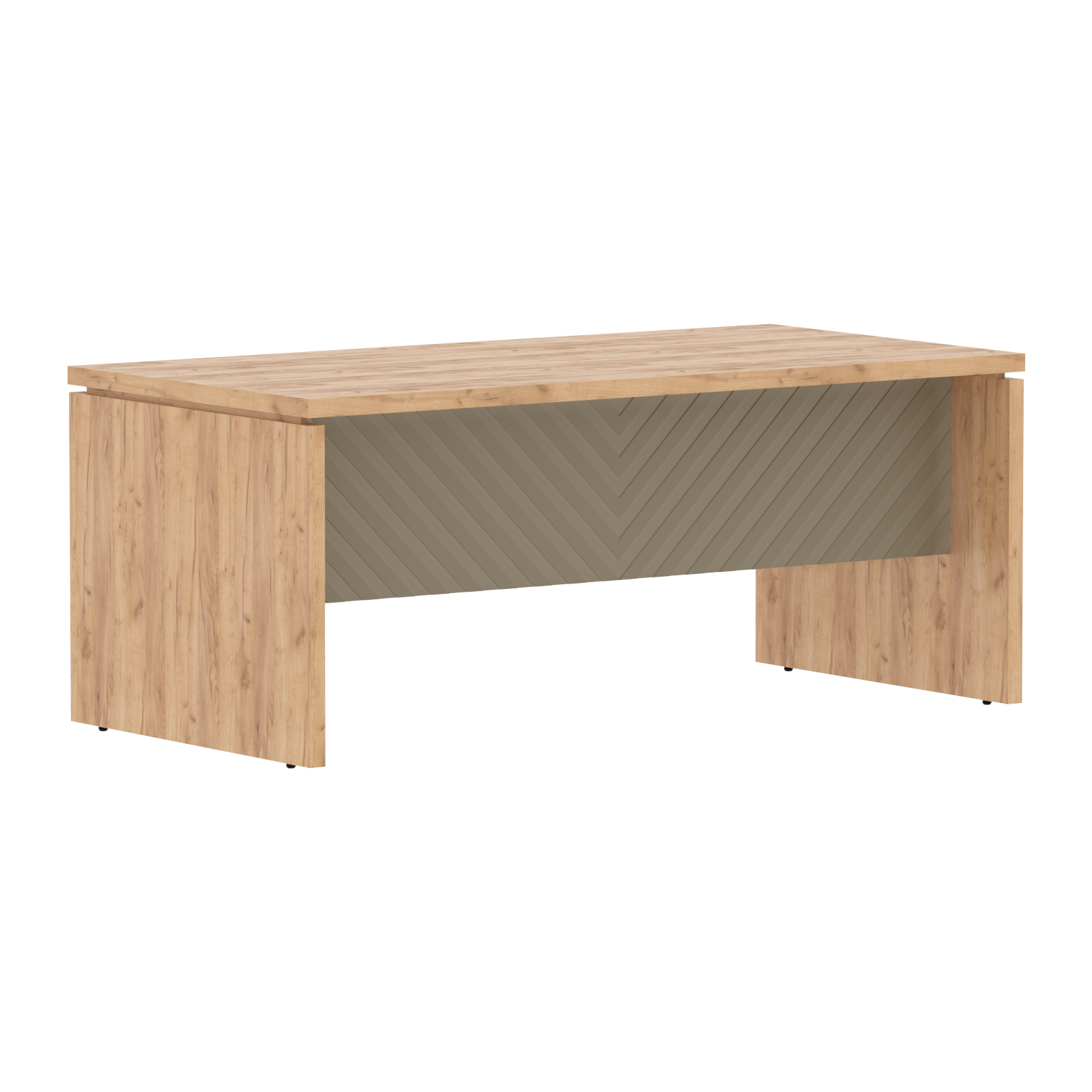Столешница и опоры из ЛДСП толщиной 38мм с кромкой ПВХ т.2мм в цвет ЛДСП. Стол комплектуется регулируемыми опорами. Фронтальная панель из одностороннего МДФ т.19мм фрезерованного крашенного матовой эмалью, высотой до пола h=640мм.