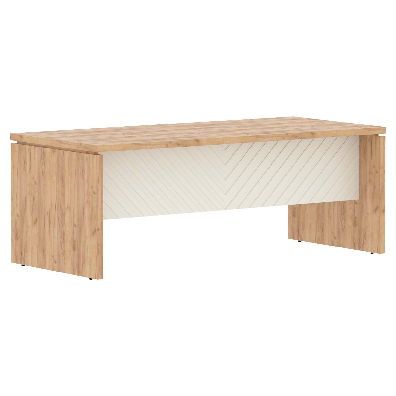 Столешница и опоры из ЛДСП толщиной 38мм с кромкой ПВХ т.2мм в цвет ЛДСП. Стол комплектуется регулируемыми опорами. Фронтальная панель из одностороннего МДФ т.19мм фрезерованного крашенного матовой эмалью, высотой до пола h=640мм.