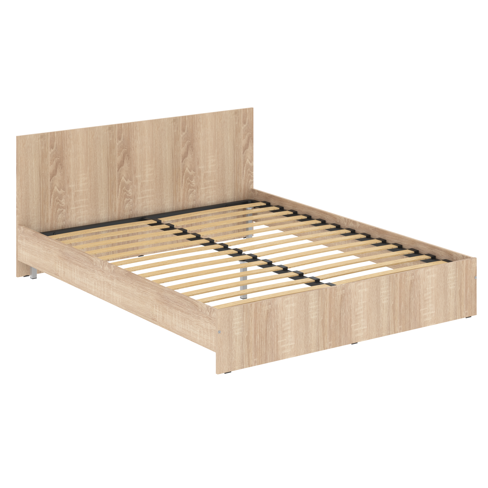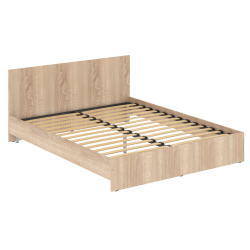 Царги выполнены из ЛДСП т.16мм. Каркас кровати комплектуются металлической рамкой с ламелями. Рамка устанавливается на 5 опор. Максимальная нагрузка 110 кг. на каждую сторону. Изголовье выполнено из ЛДСП 16 мм и крепится к кровати с помощью винтовых стяжек и шкантов.