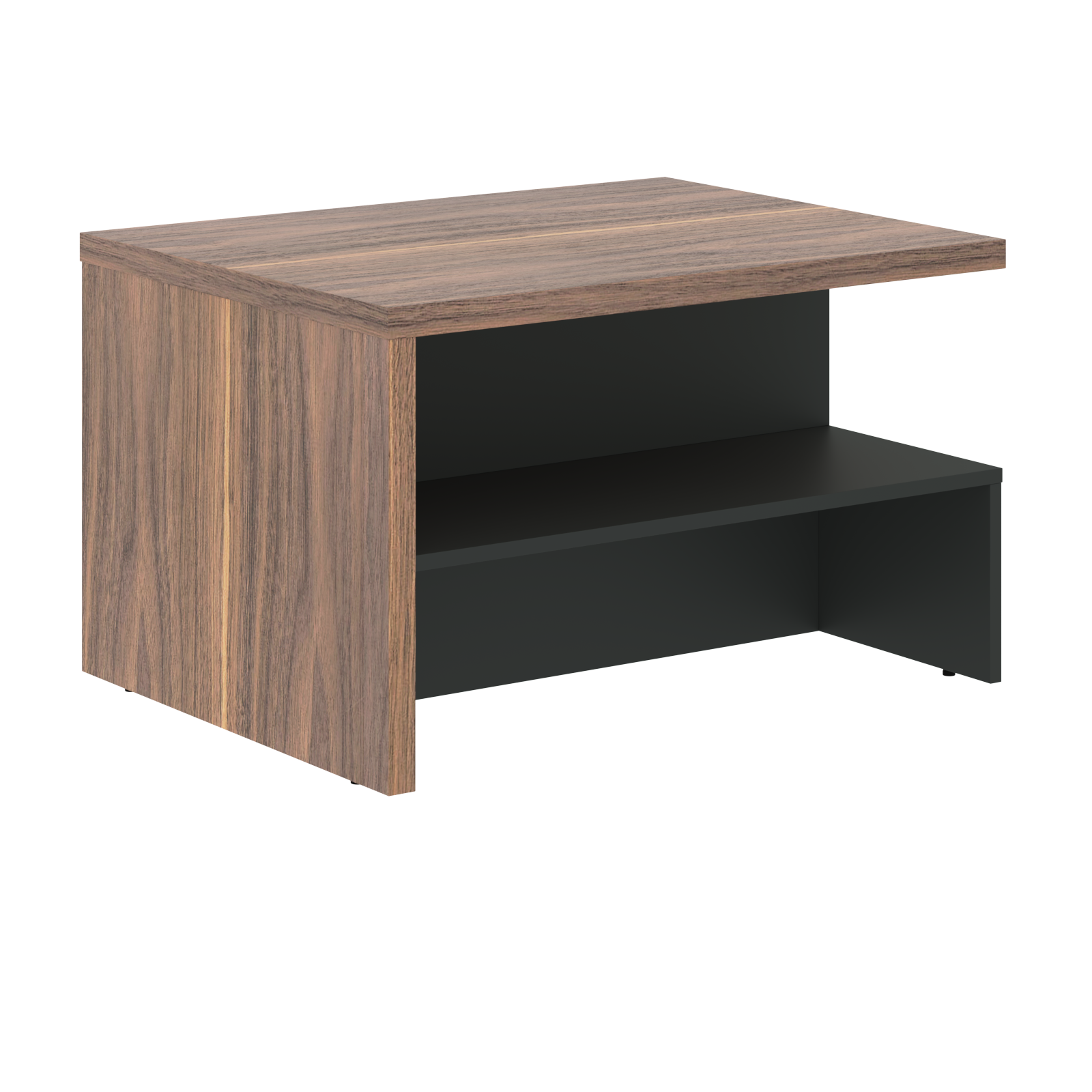Столешница выполнена из ДСП, облицована шпоном т.0,6мм с покрытием матовым лаком, с кромками в шпоне т.0,6мм. Общая толщина столешницы 36мм. Нижнее основание выполнено из двухстороннего МДФ т.18мм с покрытием пленкой ПЭТ и кромками ПВХ т.2мм.
