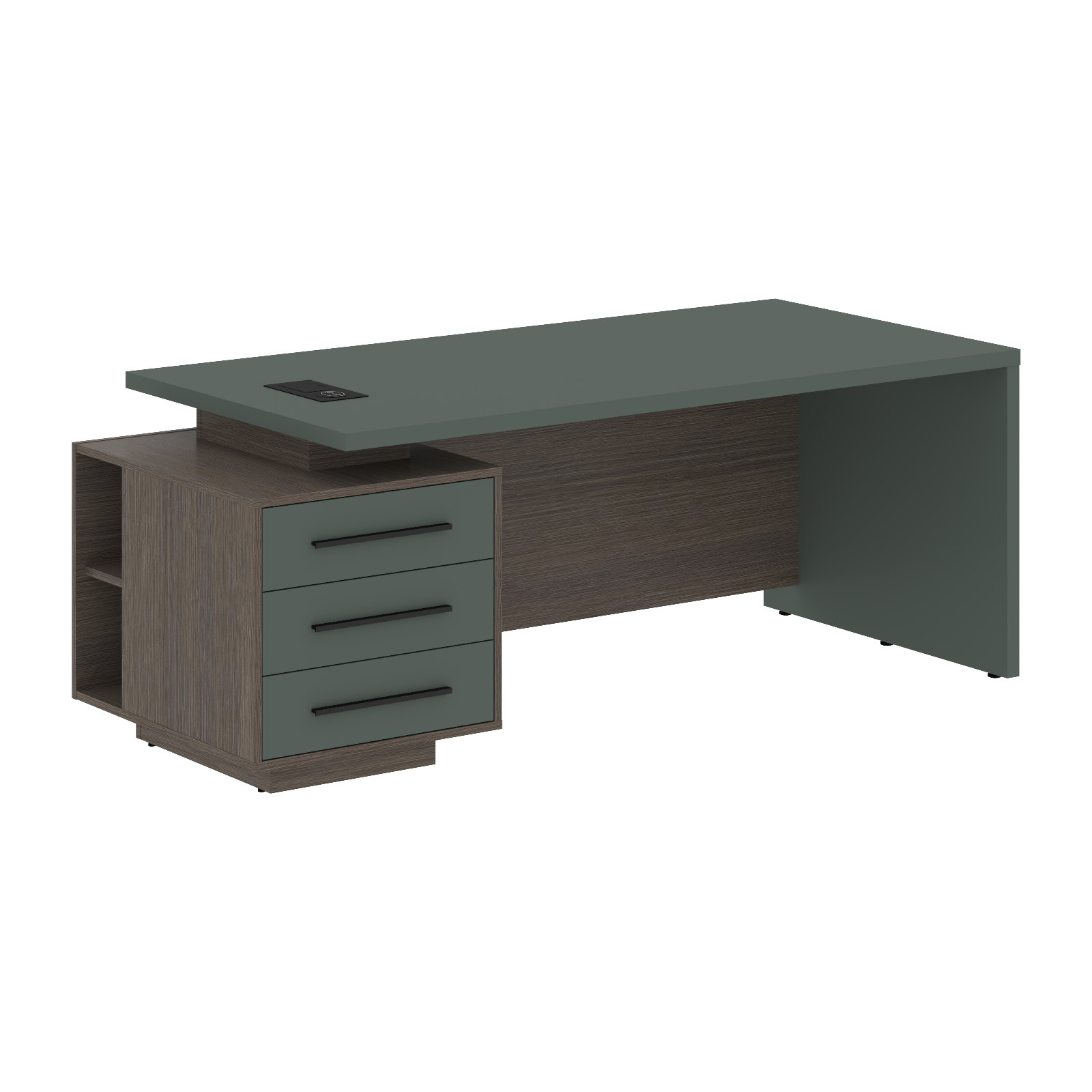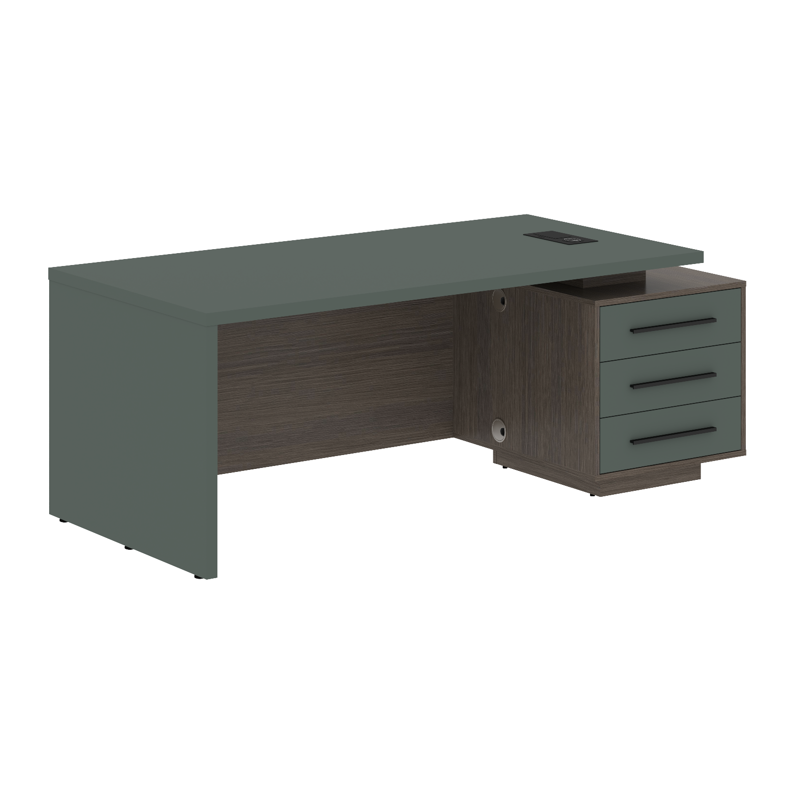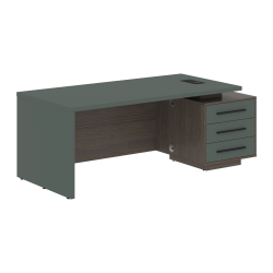 Столешница, опора выполнены из МДФ т.36мм с покрытием пленкой PET(ПЭТ), с кромками ПВХ т.2мм. Опорная тумба габаритом 603х749х546, каркас из ЛДСП т.18мм, видимые кромки ПВХ т.1мм, фасады ящиков вкладные из МДФ т.18мм в пленке PET(ПЭТ), комплектуются ручкой с межцентровым расстоянием 320мм. Ящики-фолдинги разборные 520,5х400х100мм, направляющие - шариковые с доводчиком. Фронтальная панель стола и каркаса тумбы общая, h=548мм. Для увеличения жесткости стола под столешницей установлена металлическая траверса. В столешнице встраиваемый розеточный блок AE-PB1SAVAP-20, цвет - черный, 2 порта USB A+C, индукционная зарядка 5W с проводом 1,5 метра.