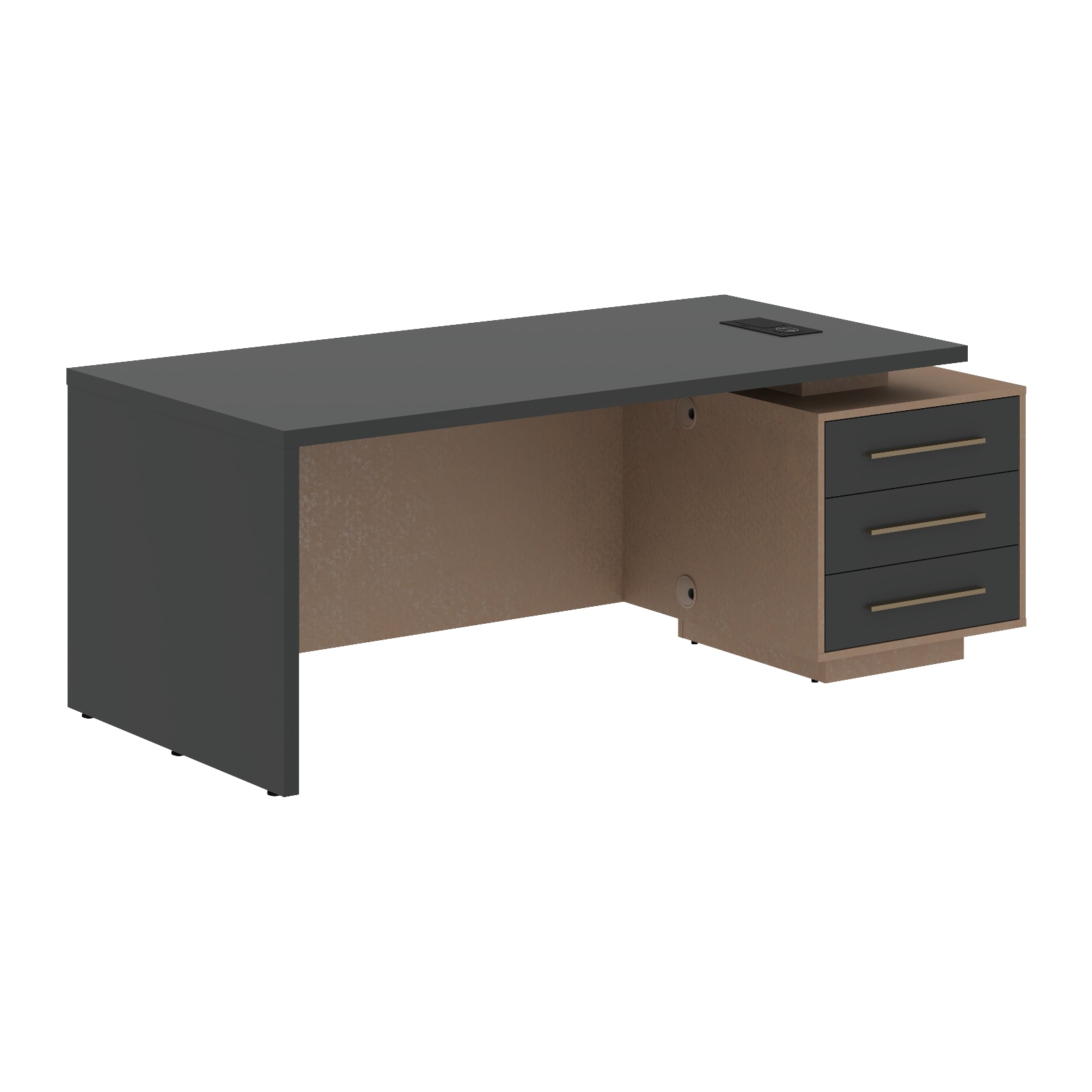 Столешница, опора выполнены из МДФ т.36мм с покрытием пленкой PET(ПЭТ), с кромками ПВХ т.2мм. Опорная тумба габаритом 603х749х546, каркас из ЛДСП т.18мм, видимые кромки ПВХ т.1мм, фасады ящиков вкладные из МДФ т.18мм в пленке PET(ПЭТ), комплектуются ручкой с межцентровым расстоянием 320мм. Ящики-фолдинги разборные 520,5х400х100мм, направляющие - шариковые с доводчиком. Фронтальная панель стола и каркаса тумбы общая, h=548мм. Для увеличения жесткости стола под столешницей установлена металлическая траверса. В столешнице встраиваемый розеточный блок AE-PB1SAVAP-20, цвет - черный, 2 порта USB A+C, индукционная зарядка 5W с проводом 1,5 метра.
