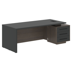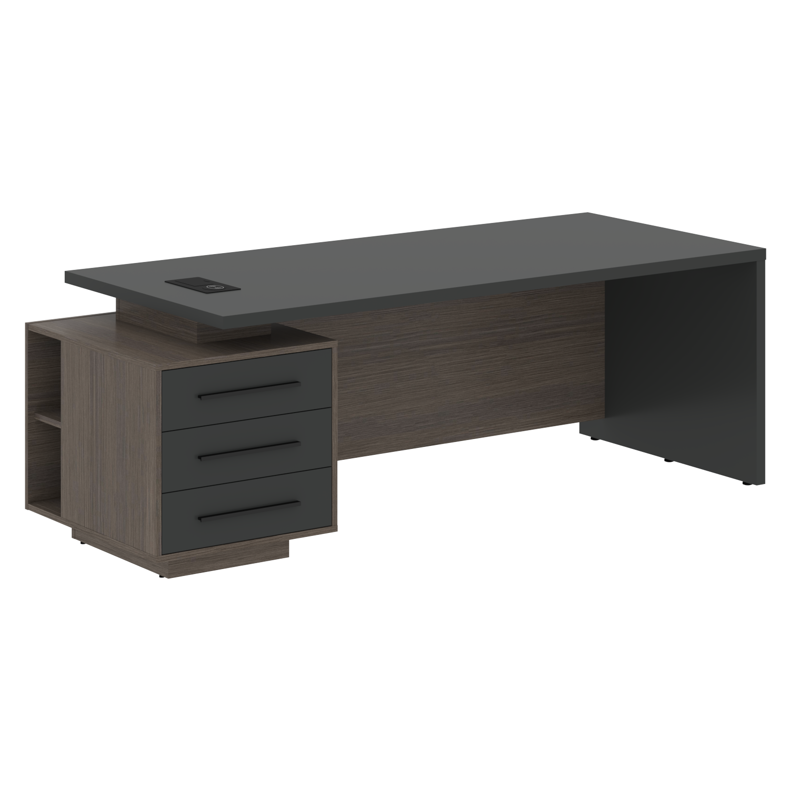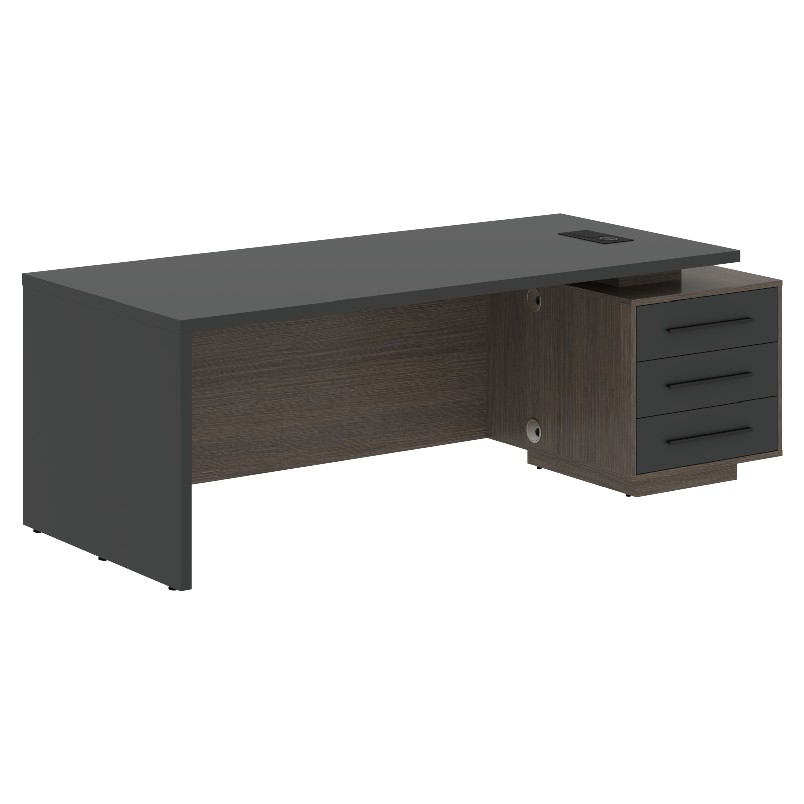 Столешница, опора выполнены из МДФ т.36мм с покрытием пленкой PET(ПЭТ), с кромками ПВХ т.2мм. Опорная тумба габаритом 603х749х546, каркас из ЛДСП т.18мм, видимые кромки ПВХ т.1мм, фасады ящиков вкладные из МДФ т.18мм в пленке PET(ПЭТ), комплектуются ручкой с межцентровым расстоянием 320мм. Ящики-фолдинги разборные 520,5х400х100мм, направляющие - шариковые с доводчиком. Фронтальная панель стола и каркаса тумбы общая, h=548мм. Для увеличения жесткости стола под столешницей установлена металлическая траверса. В столешнице встраиваемый розеточный блок AE-PB1SAVAP-20, цвет - черный, 2 порта USB A+C, индукционная зарядка 5W с проводом 1,5 метра.