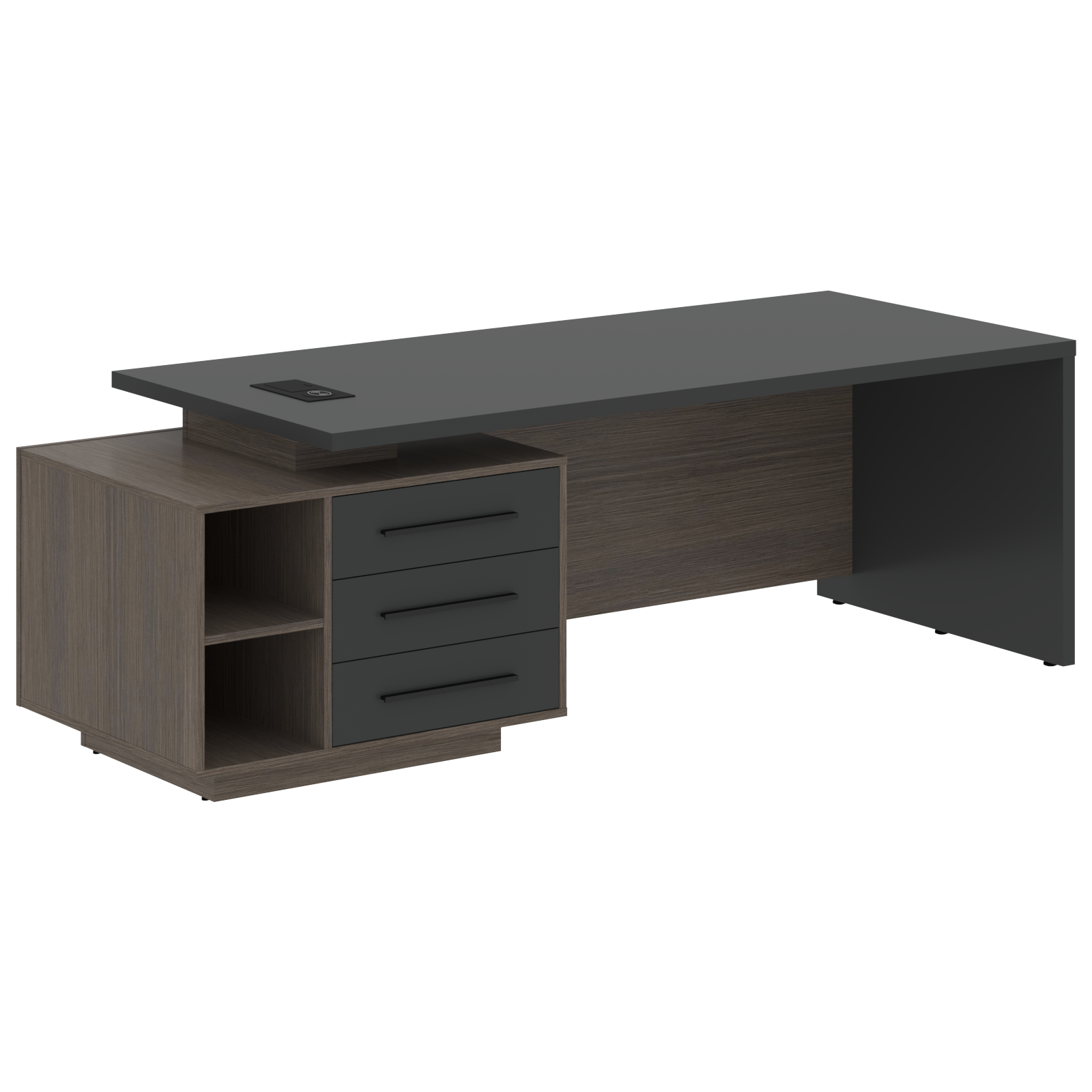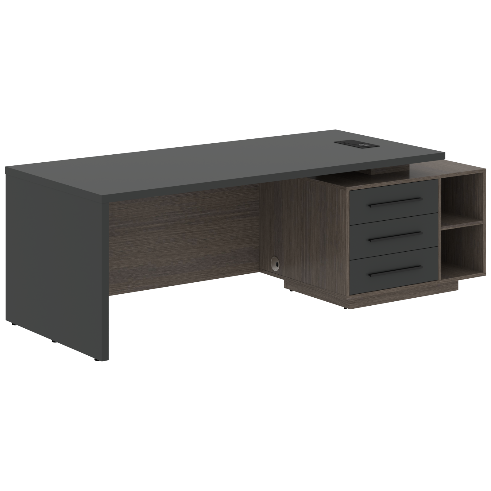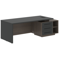 Столешница, опора выполнены из МДФ т.36мм с покрытием пленкой PET(ПЭТ), с кромками ПВХ т.2мм. Опорная тумба габаритом 603х749х546, каркас из ЛДСП т.18мм, видимые кромки ПВХ т.1мм, фасады ящиков вкладные из МДФ т.18мм в пленке PET(ПЭТ), комплектуются ручкой с межцентровым расстоянием 320мм. Ящики-фолдинги разборные 520,5х400х100мм, направляющие - шариковые с доводчиком. Фронтальная панель стола и каркаса тумбы общая, h=548мм. Для увеличения жесткости стола под столешницей установлена металлическая траверса. В столешнице встраиваемый розеточный блок AE-PB1SAVAP-20, цвет - черный, 2 порта USB A+C, индукционная зарядка 5W с проводом 1,5 метра.
