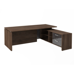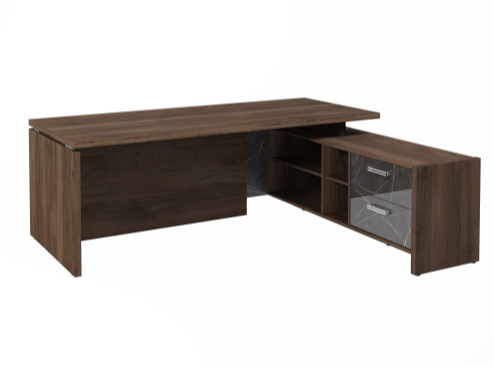 Столешница, бок стола и бок тумбы выполнены из ЛДСП толщиной 38 мм. Цвет - "Орех Пацифик Табак". Кромка 2 мм.