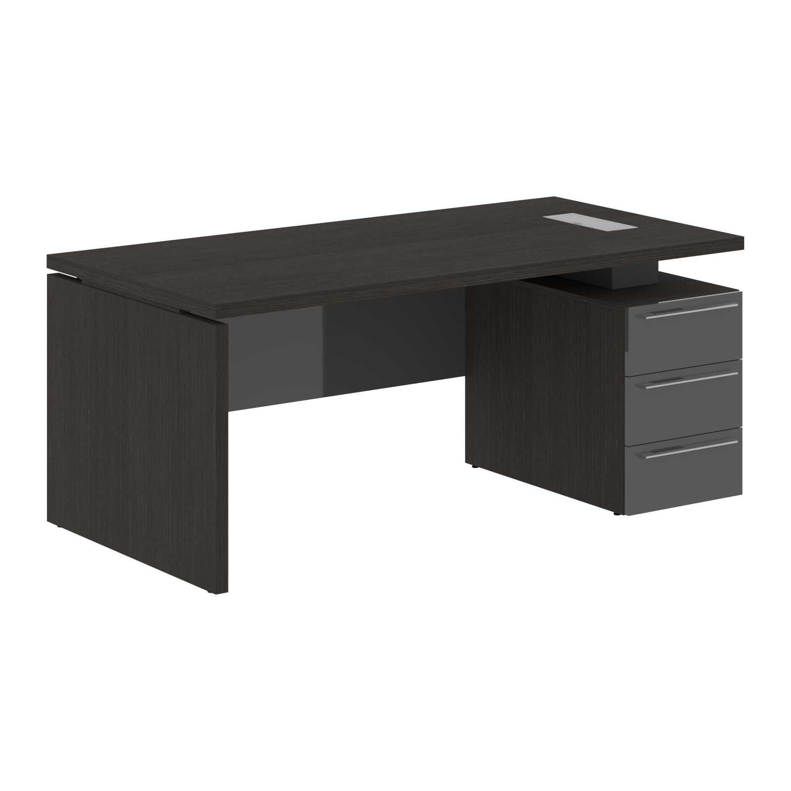 Столешница, опора из МДФ т.39мм, облицованы шпоном с защитно-декоративным покрытием. Царга из МДФ т.18мм с защитно-декоративным покрытием "высокий глянец", высота 350 мм. Каркас тумбы из МДФ т.18 мм, облицован шпоном с защитно-декоративным покрытием. Ящики из ЛДСП т.18мм, торцевые поверхности защищены кромкой ПВХ т.1 в цвет. Направляющие ящиков - шариковые 450мм с доводчиками. Фасады из МДФ т.18мм с защитно-декоративным покрытием "высокий глянец". Ручки металлические ORION 320/340. Проставки в столе из МДФ т.16 мм с защитно-декоративным покрытием "матовый". Заглушка кабель-канала и ручка в цвет проставок стола. Опоры регулируемые.