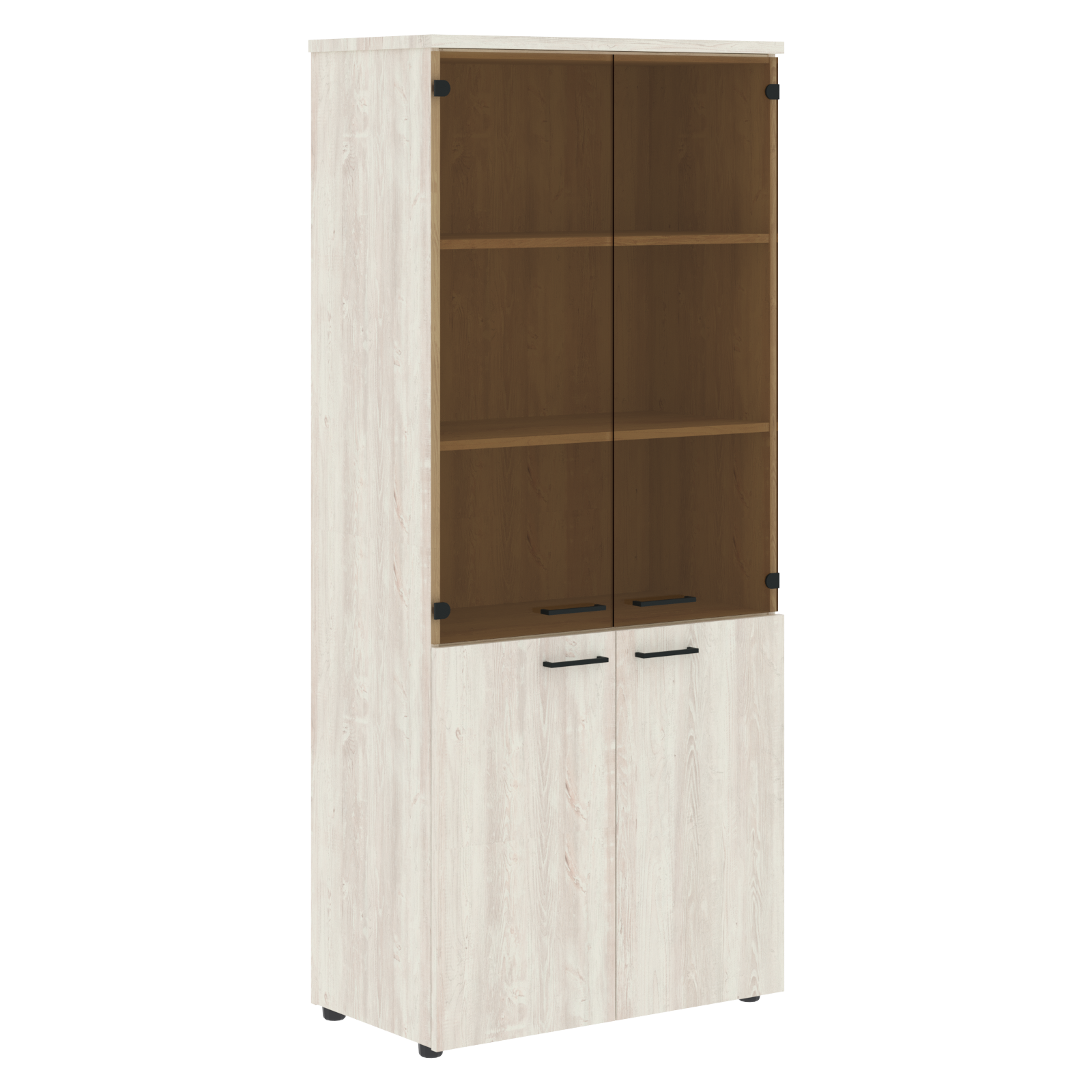 Двери: Из ЛДСП т. 18мм.,кромка ПВХ т. 2мм. по периметру. Ручка-скоба, цвет - алюминий, для декора Сосна Эдмонт цвет - черный.