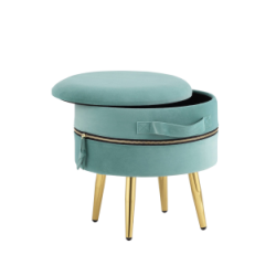 Оригинальный пуф, который дополнит интерьер спальни, прихожей или детской. Обивка выполнена из мягкого велюра с декоративной молнией. Под сиденьем имеется ящик для хранения различных мелочей. Ножки изготовлены из металла в золотом цвете. На них предусмотр