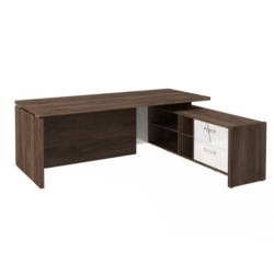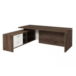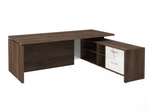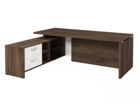 Столешница, бок стола и бок тумбы выполнены из ЛДСП толщиной 38 мм. Цвет - "Орех Пацифик Табак". Кромка 2 мм.